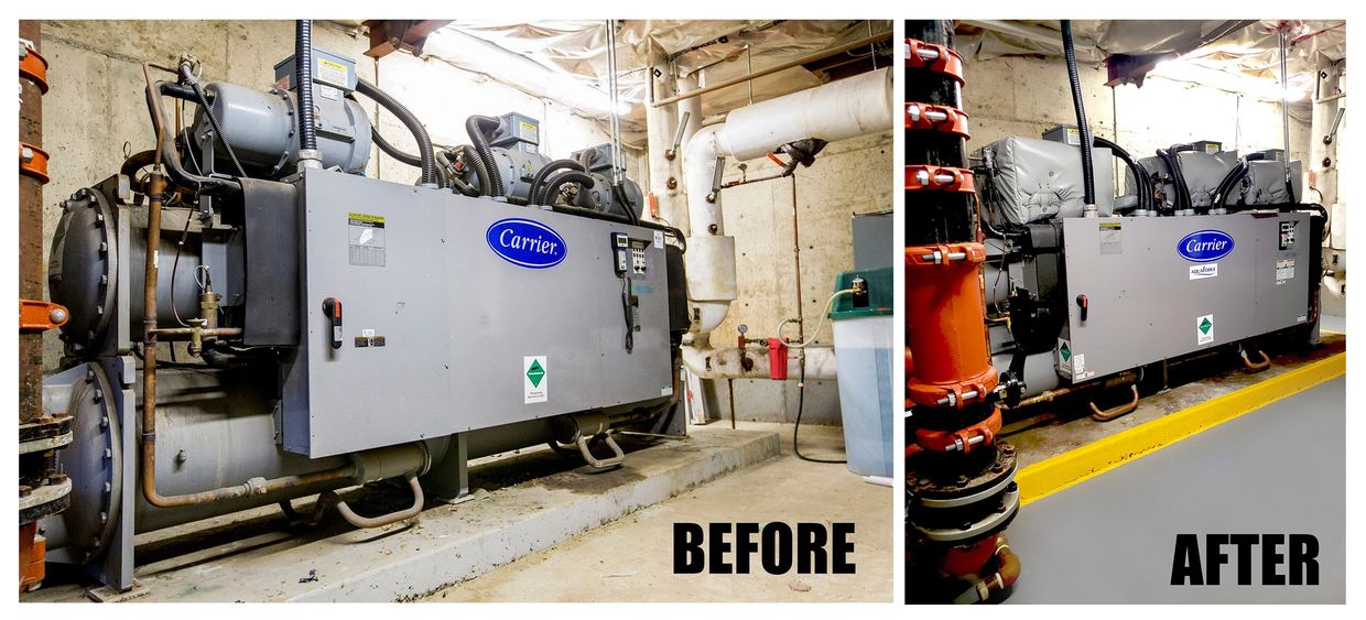 This was no easy feat. The chiller was located in a mechanical room located under the building, with the only access being through small man-doors.